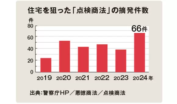 「悪質なリフォーム業者による点検商法」は、古くからある詐欺の手口ですが、現在も被害が相次いでいます。特に2024年度では、点検商法の摘発件数が過去最多の66件に上り、その中でもトクリュウが関与している事例が目立っています。