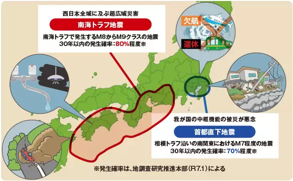 実際、令和7年1月時点の地震調査研究推進本部の予測によると、南海トラフ地震は「今後30年以内に発生する確率が約80%」、首都直下地震は「約70%」とされています。