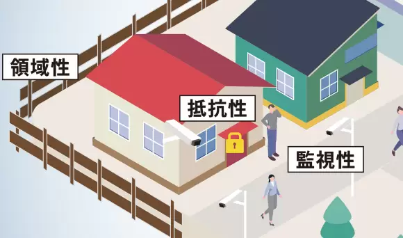 | 監視性:「人の目がある」と思わせることで侵入をためらわせる 例:植栽を低く整える、近隣とのあいさつや地域パトロール、防犯カメラの設置など |