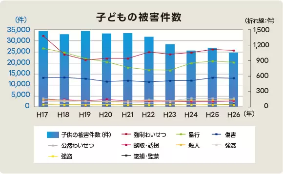 子供の犯罪被害件数は、警察庁の平成19年~28年の調査によると減少傾向にありますが、1年で約17万件~34万件発生しており、決して少なくありません。特に多い暴行・傷害は年間約1,500件で1日に約4件、強制・公然わいせつは年間約1,000件で1日に約3件発生しており、まだまだ油断はできない状況となっています。不審者は子供が一人で行動する通学路を狙うことがあり、人目の少ない場所で待ち伏せし、子供を拉致するという事件も発生しています。